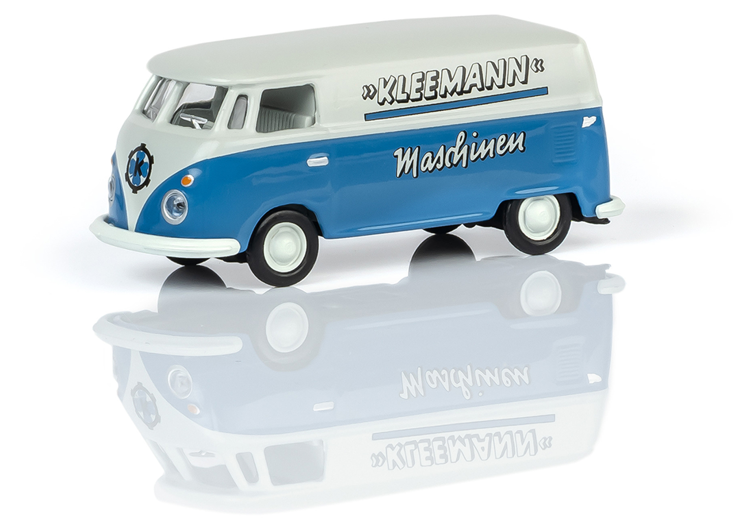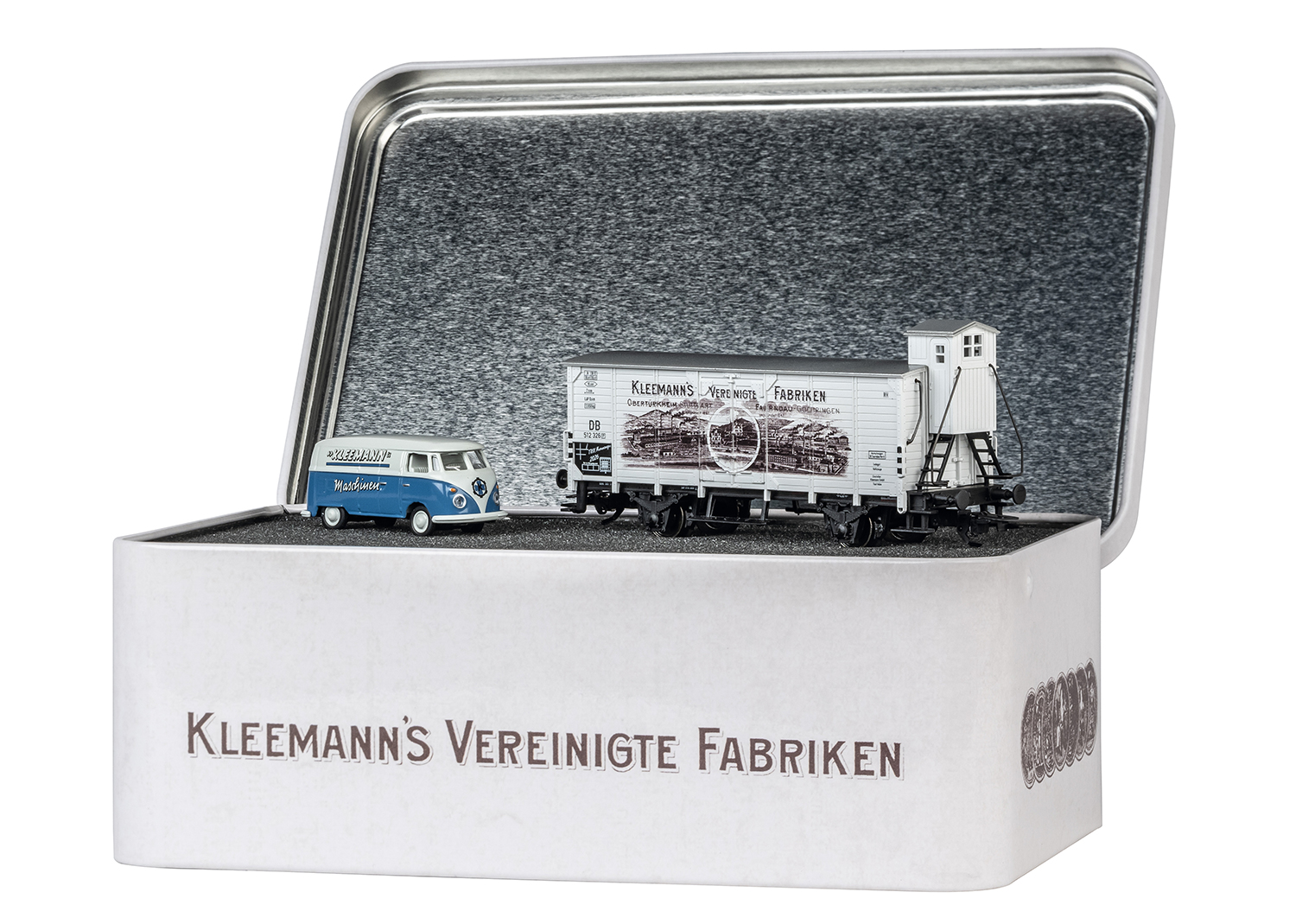 Vorbild: Dreiachsiger gedeckter Güterwagen der Bauart G 07 mit Bremserhaus und längsseitiger Werbebeschriftung. Lichtgraue Grundfarbgebung als Privatwagen der Firma Kleemann, Göppingen, eingestellt bei der Deutschen Bundesbahn (DB). Ein PKW Volkswagen T1 Bulli als Firmenwagen der Firma Kleemann. Fiktiver Betriebszustand um 1957.