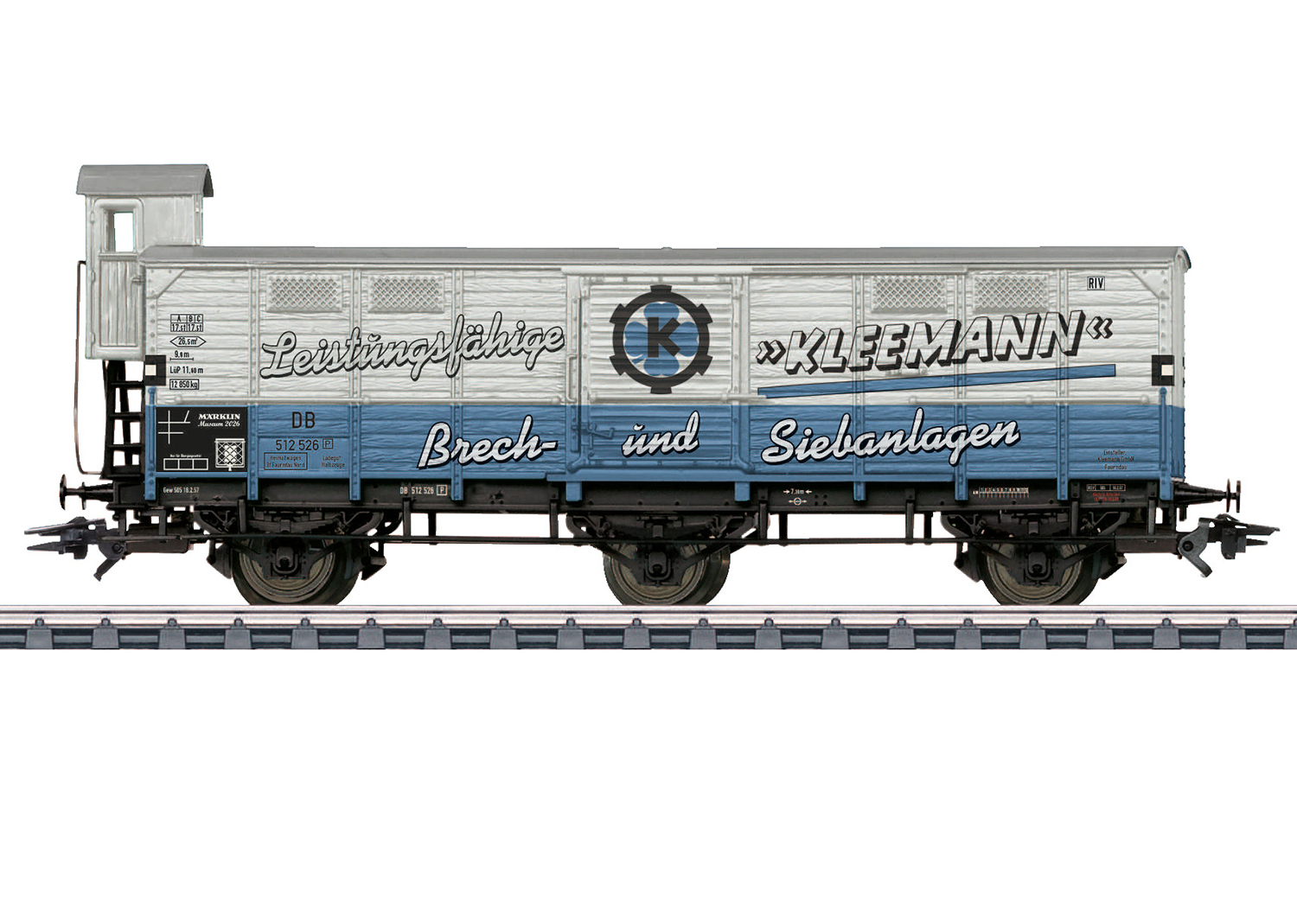 Vorbild: Gedeckter, privater Güterwagen G 07 mit Bremserhaus und längsseitiger Werbebeschriftung der Firma Kleemann, Göppingen, eingestellt bei der Deutschen Bundesbahn (DB). Fiktiver Betriebszustand um 1957.